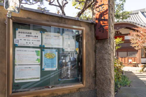 正山寺の門前には、「あなたのお話 お聴きします」と書かれた貼り紙が掲げられている