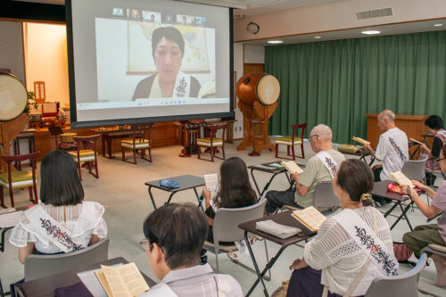 同プログラムは、コロナ禍によって教会参拝が制限される中、ローマセンター、ロンドンセンター、RKINAの会員がオンラインで交流する取り組みを基にしたものだ。水藻克年浜北教会長が昨年11月までローマセンター長を務めていたことから、今年新たに、時差を考慮した3拠点をつないでスタート。5月に第1回を開催した。今回は日本の「終戦の日」に近い開催であることから、『平和』がテーマに掲げられた。浜北教会には会員約30人が集った。