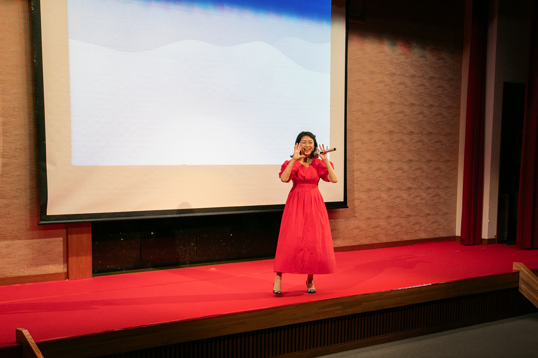 真っ赤なワンピースに弾ける笑顔の“お姉さん”が登場すると、子どもたちの黄色い歓声が上がる――。8月31日、立正佼成会セレニティホール(東京都杉並区)を会場に、「みんなで楽しむ『えほんシネマ』と『うた』の時間」が開催された。2回目となる同イベントで今年もマイクを握ったのは、NHK・Eテレの幼児向け番組「おかあさんといっしょ」で第16代歌のお姉さんを務めた神崎ゆう子さんだ。