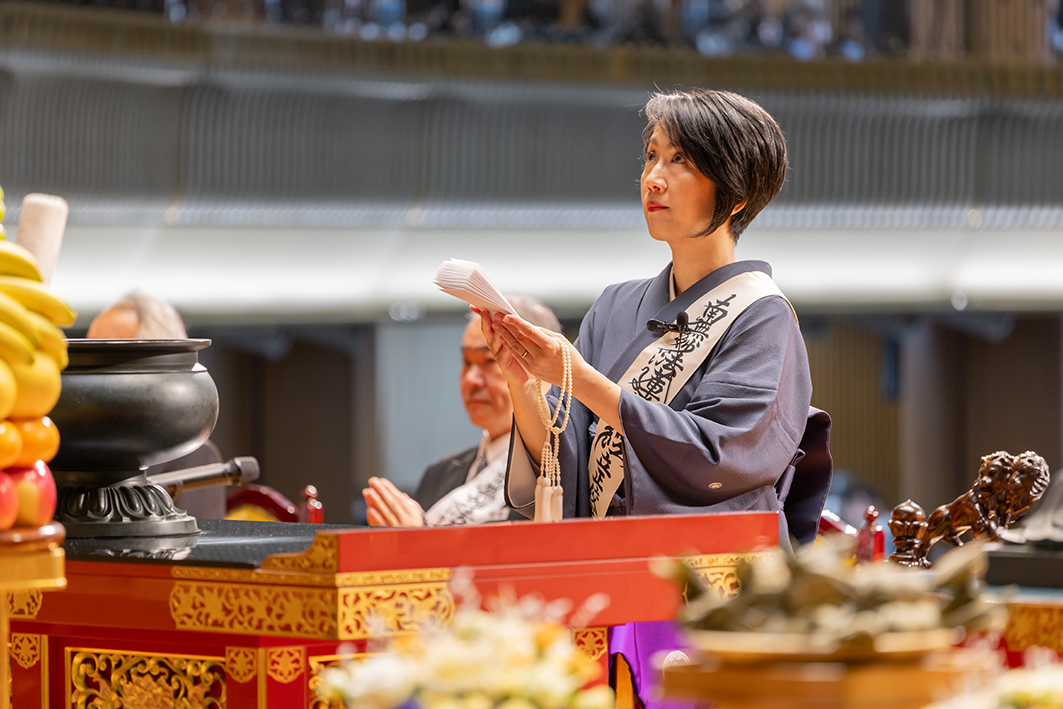 9時の開式の後、式典では「開祖さまとの対話」の時間に続いて読経供養が行われ、導師をつとめた庭野光祥次代会長により、庭野会長の「報恩讃歎(さんだん)文」が奏上された。