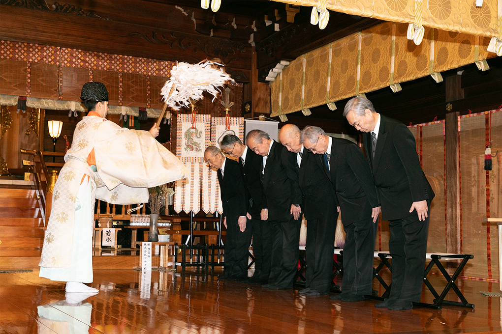 庭野会長は、同宮清涼殿応接室で鎌田宮司と懇談、元朝の大聖堂や同宮の様子などが話題となった。この後、拝殿に進み、正式参拝に臨んだ。修祓、献饌、神楽奉納と続き、庭野会長はじめ参拝者が玉串を奉てんし、平和の祈りを捧げた。