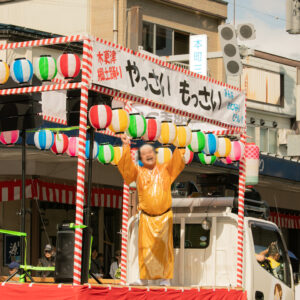 庭野日鑛会長の〝米寿イヤー〟の今年、横断幕や観覧席前での「お披露目」で、祝いのメッセージを伝える教会が多く見られた。長岡教会は、地元の藩士・小林虎三郎の逸話で知られる「米百俵」に掛けて、米俵を積んだ山車が隊列を先導。万灯行進とともに、少年部や青年婦人部が小分けにした米を庭野会長や来賓らに手渡した。南多摩教会では、婦人部を中心とした踊り隊28人が、観覧席で見守る庭野会長のもとに集まり、「米寿おめでとうございます」とのメッセージを伝え、手話で「世界に一つだけの花」の歌を披露した。カラフルな衣装と弾ける笑顔に、庭野会長も手を振って応えた。