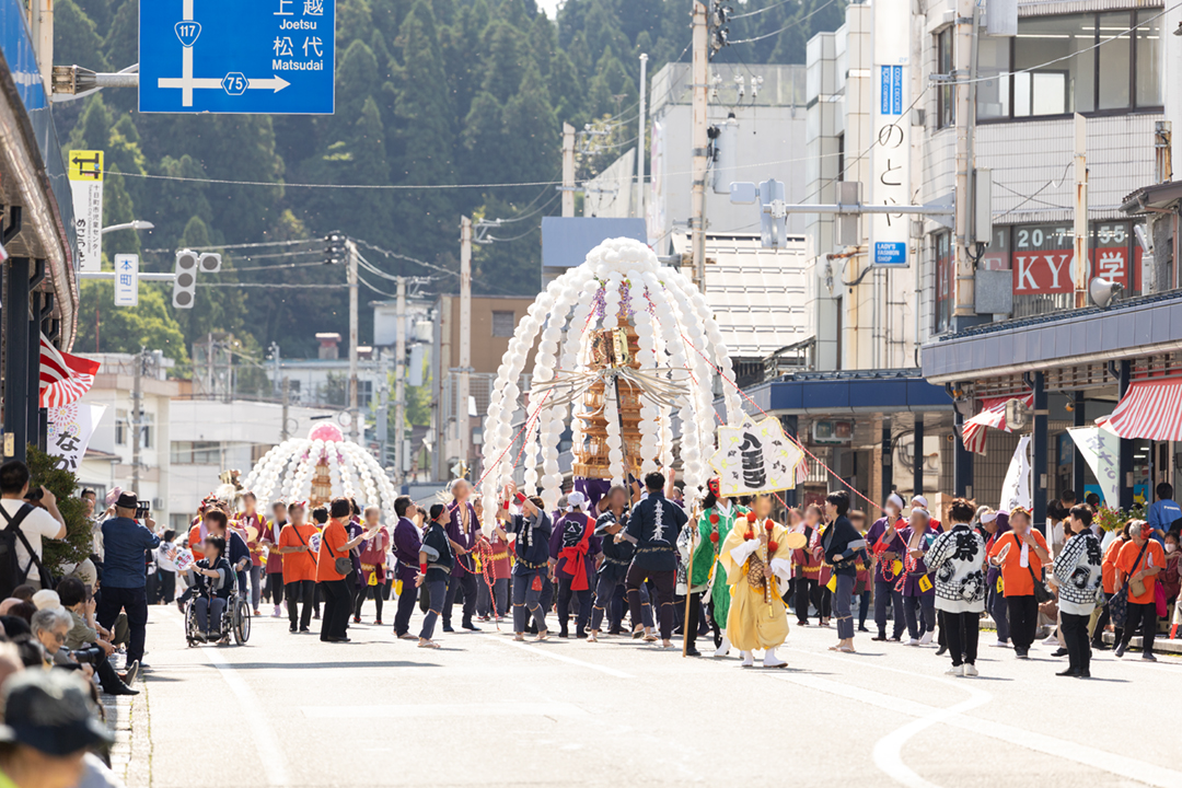 「第49回生誕地まつり」の会場となった新潟県十日町市は、前日の冷たい雨が上がり、朝から真夏のような日差しが降り注いだ。10月12日午前10時、紅白の幕が彩る国道117号線を舞台に「市中行進」がスタート。同まつり実行委員会メンバー、十日町大太鼓のほか、本会から48教会4096人が参加し、マトイや万灯、鳴り物、各地の郷土芸能など趣向を凝らした行進が繰り広げられ、沿道に集まった観客は手作りうちわや手拍子で応援した。